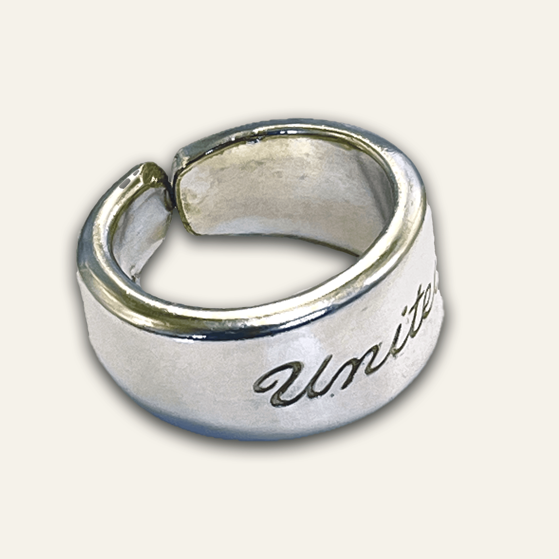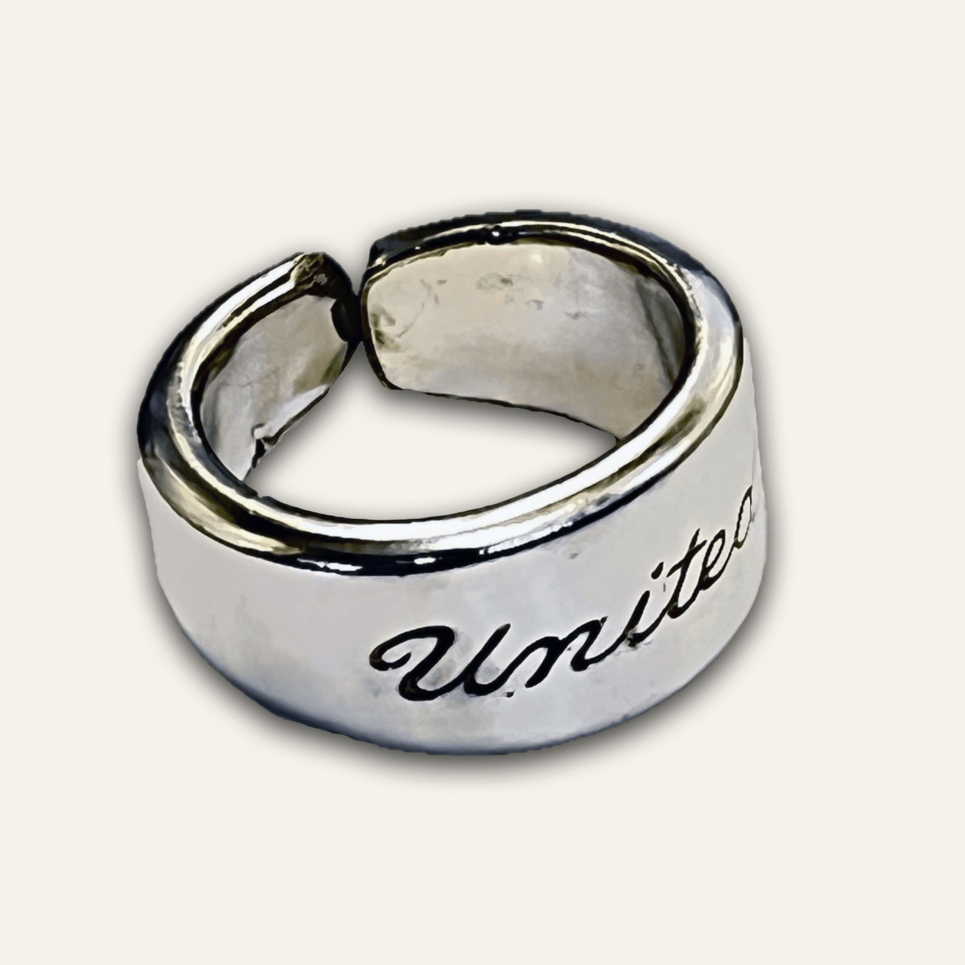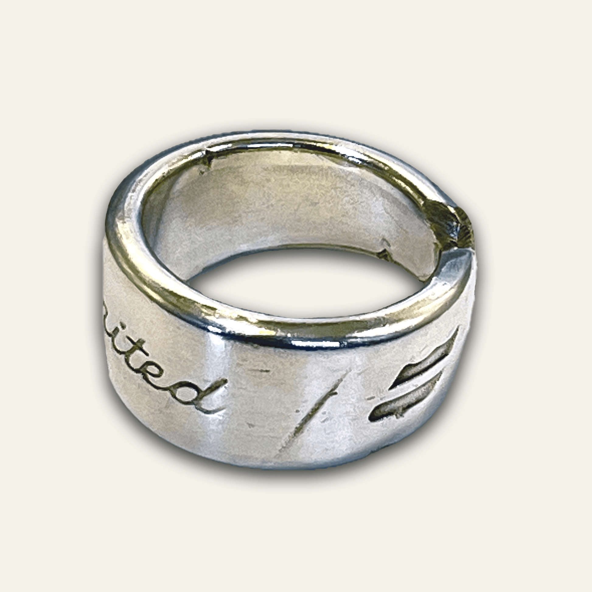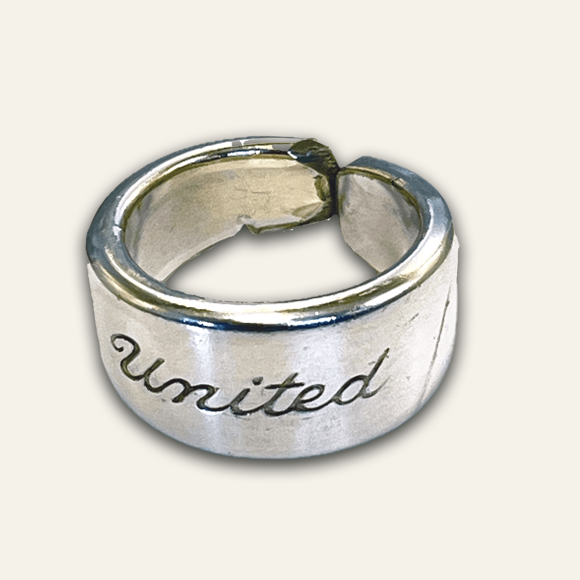 Once, this spoon lived a glamorous life: serving meals in first class while passengers smoked in coach, kids got pilot wings, and the biggest baggage fee was whether your Samsonite matched your shoes. Now? It's been hammered, bent, and reborn as a ring that carries the word "United" - and a sky full of stories.