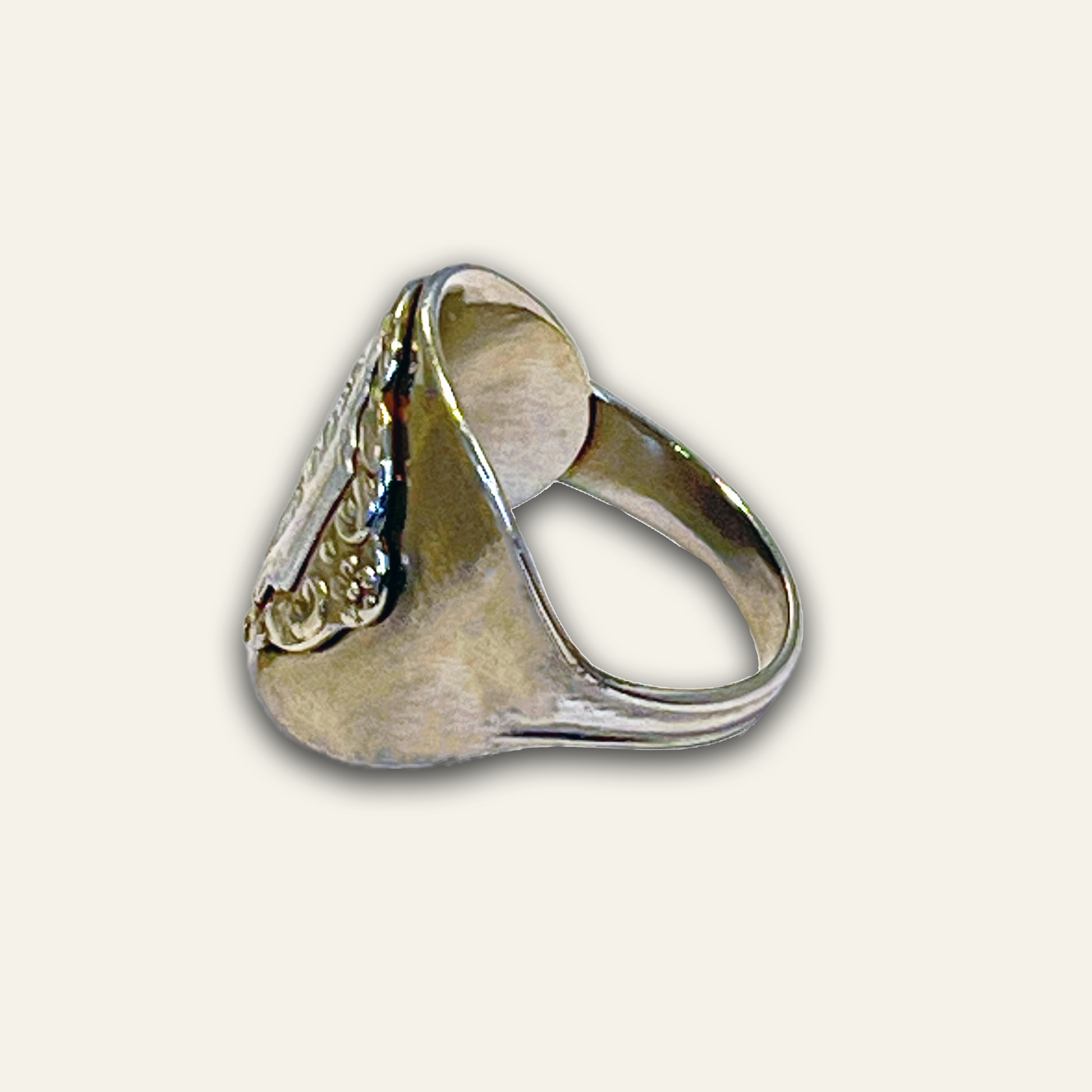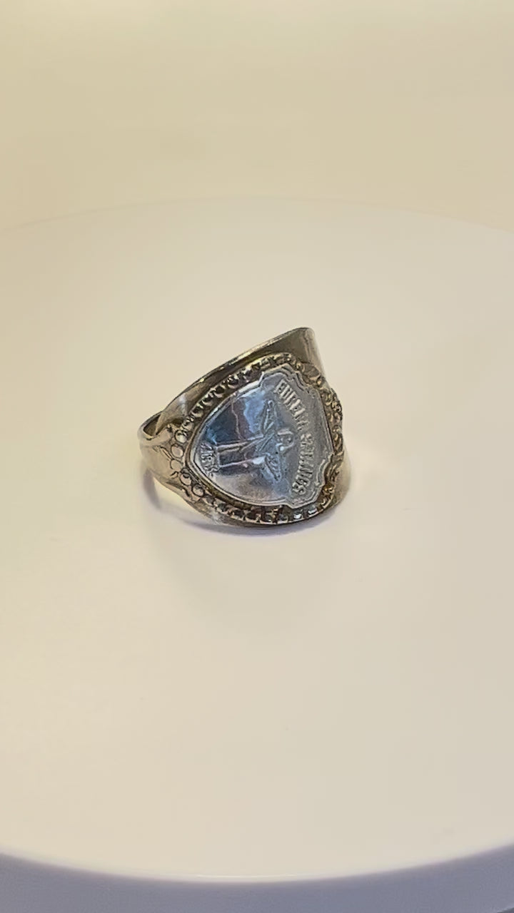Once a keepsake from a trip to Eureka Springs, this silver-plate souvenir spoon has graduated to center stage as a bold, handcrafted ring. The face bears the shielded image of Christ of the Ozarks—the seven-story statue that has overlooked this Victorian mountain town since 1966 (height ~67 ft, arm span ~65 ft). It’s a tiny monument you can actually wear.