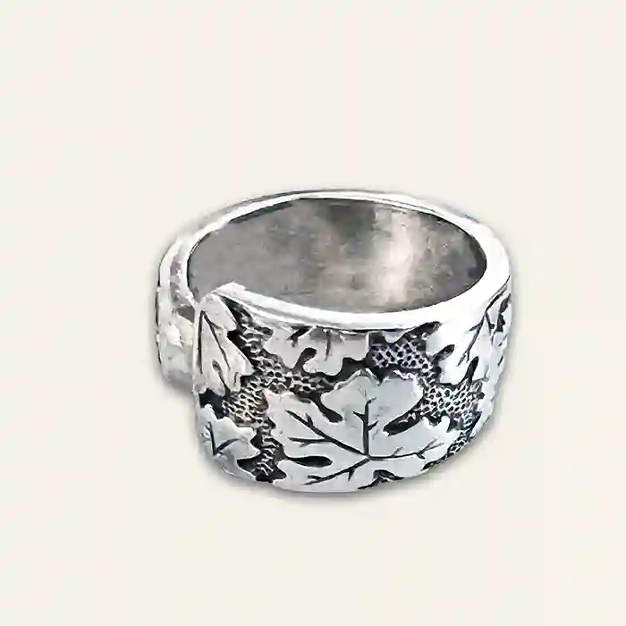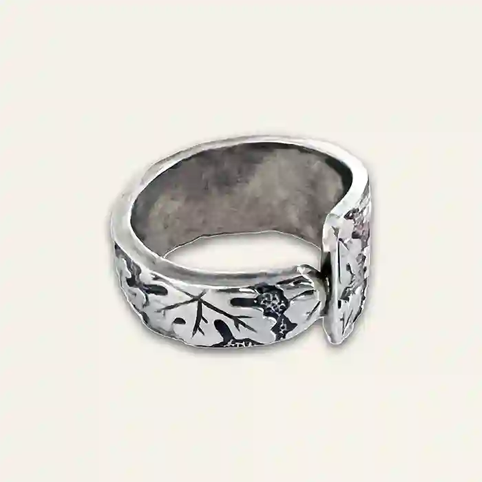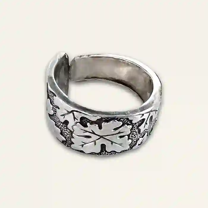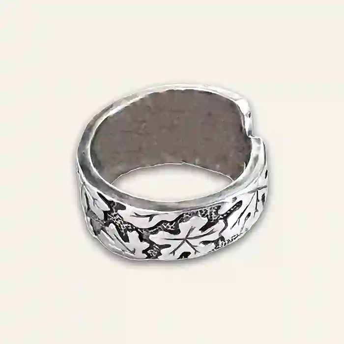 This ring is pure vintage romance. Handcrafted from a silver-plated spoon with an allover foliate scroll pattern, it's full of movement and texture - leaves curling and flowing across the entire surface in a design that feels both timeless and unique.